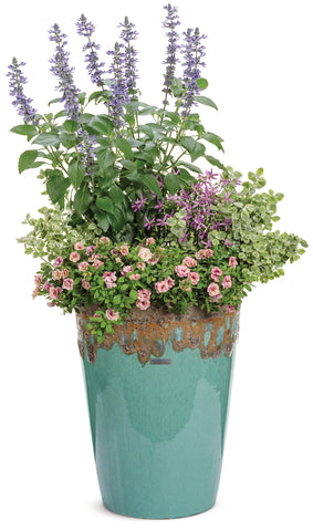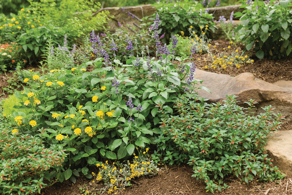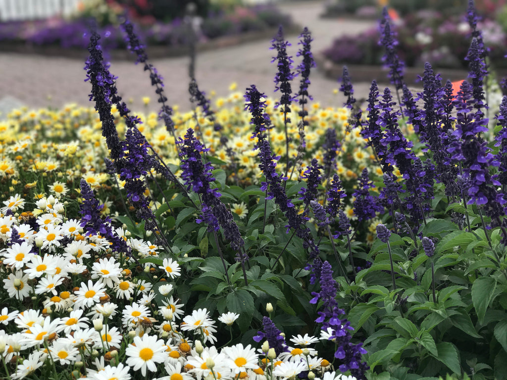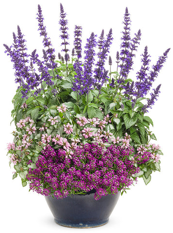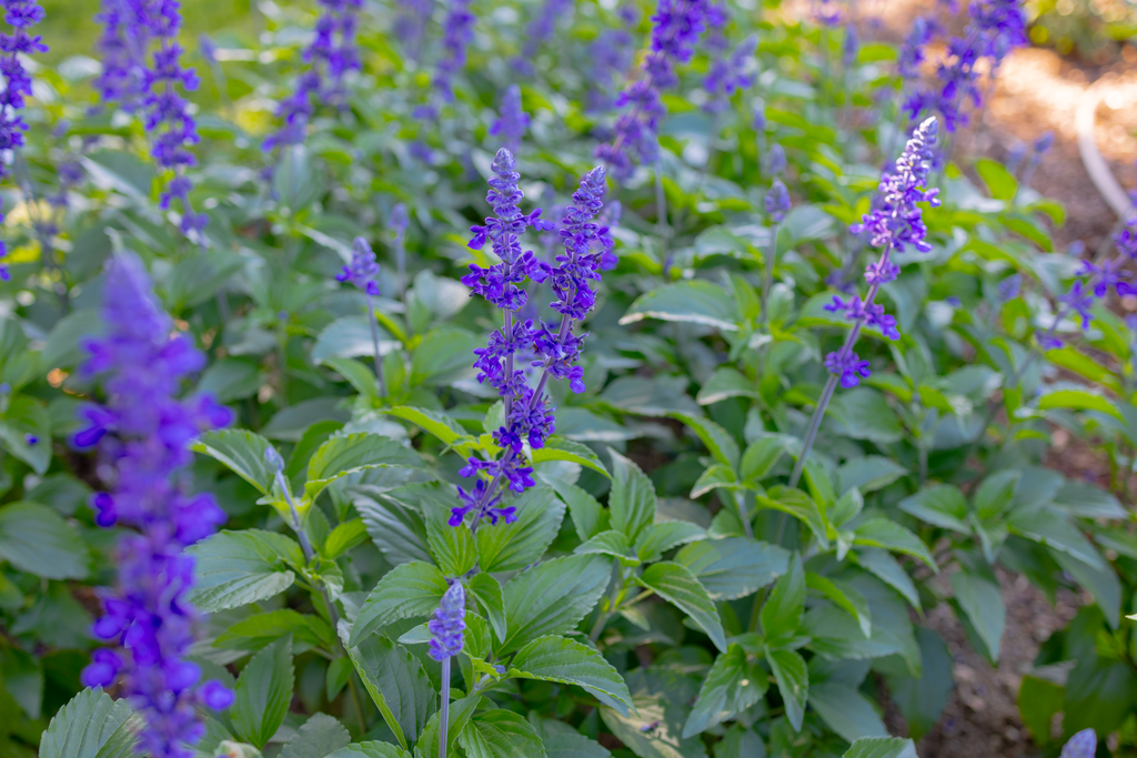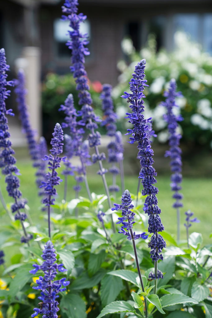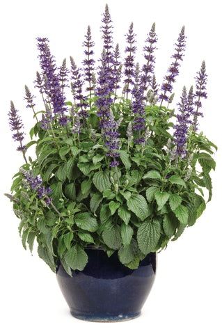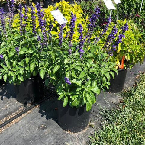 A long-blooming salvia with deep indigo-blue flowers that emerge from smoky black calyxes, giving it a rich, layered look in the garden. The upright habit and continuous blooms make it perfect for sunny borders, large planters, or mixed pollinator displays. Hummingbirds and bees flock to its nectar-rich spikes, while deer and rabbits usually stay away. Thriving in full sun and well-drained soil, it handles heat and drought with ease, providing steady color and texture from early summer through frost.