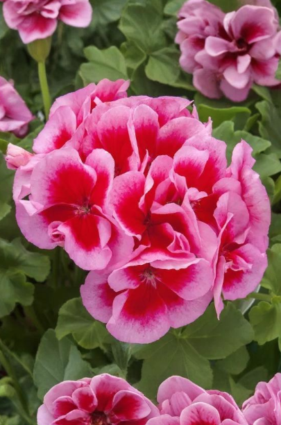 This geranium cultivar boasts large, semi-double rose-pink flowers with deep hot pink centers, creating a striking visual contrast. Its vigorous, mounding habit makes it ideal for high-impact baskets, large pots, and landscape applications. The plant thrives in full to part sun and is heat and drought-tolerant, ensuring continuous blooming from late spring through early fall.