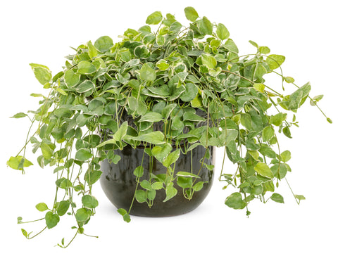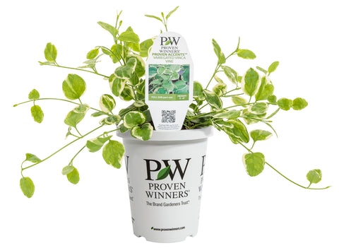 An attractive ground cover or pot stuffer known for its striking variegated leaves and beautiful blue-purple flowers. The glossy, green leaves are edged with creamy white, creating a lovely contrast that brightens up shaded or partially shaded areas. This perennial plant can spread up to 3 feet wide, making it perfect for covering large areas, climbing over rocks, or cascading down walls.