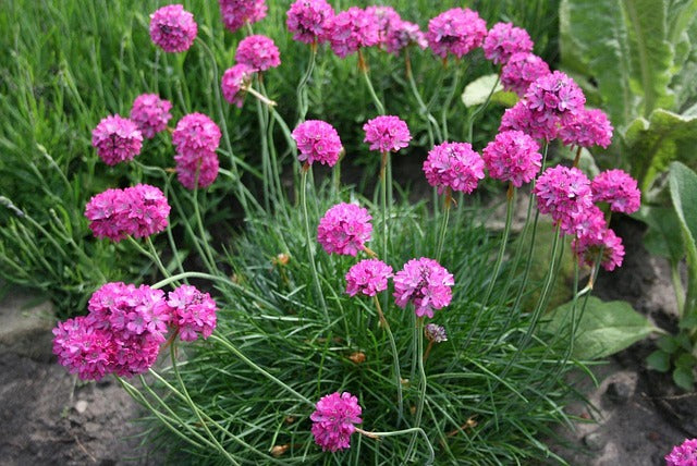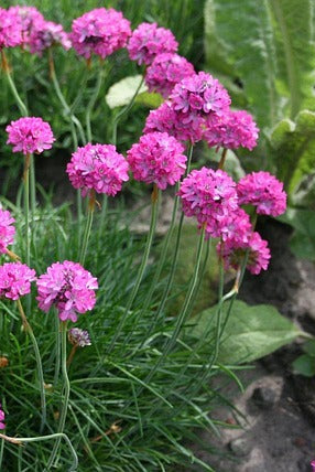 A charming, low-growing perennial with tufts of grass-like foliage and dense, globe-shaped clusters of bright pink flowers held above the leaves on slender stems. Splendens blooms profusely from late spring into summer, creating vibrant color in rock gardens, borders, and coastal-themed landscapes. Its tidy, mounded habit adds texture and year-round interest even when not in bloom.